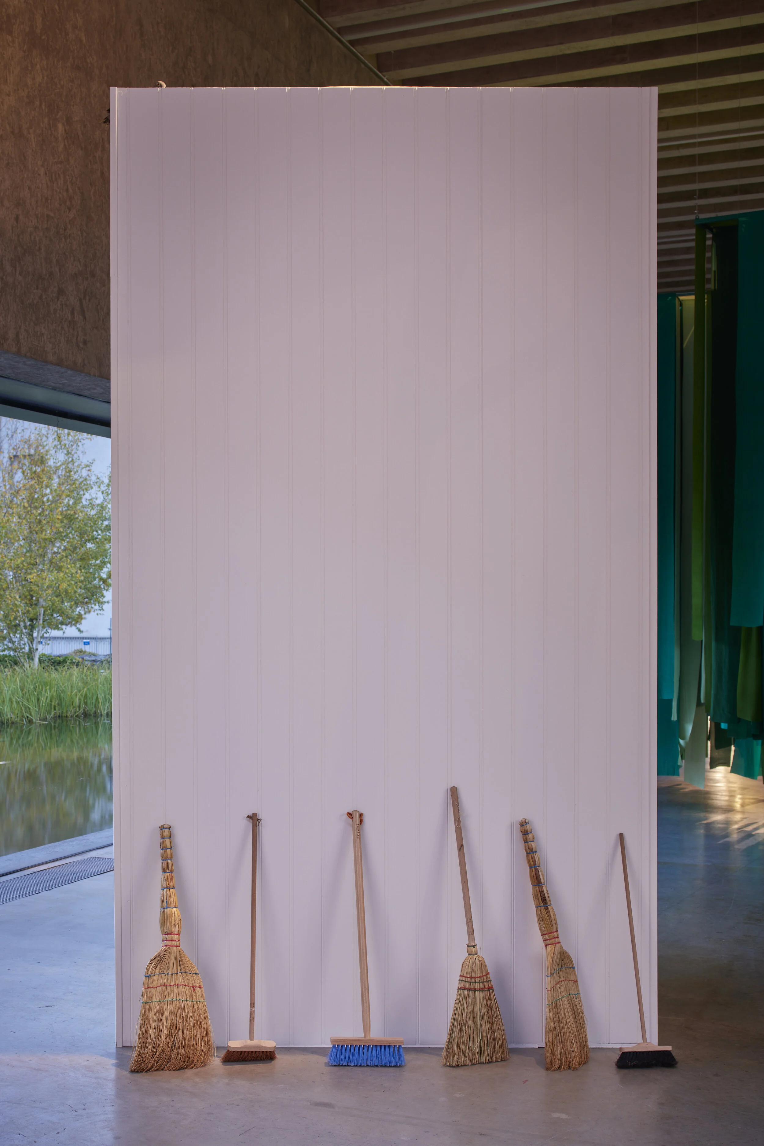 Elemental contains a major commission from Caoimhe Kilfeather, with artworks that suggest an imagined garden of both indoor and outdoor elements. One element, created from hundreds of metres of green Indian silk, hanging 3 metres high, offers pockets of space for children to inhabit. A wooden structure perches 5 metres high overlooking the exhibition space, the floor covered with cushions and 'leaves' fashioned from organdie, with brooms and sweeping brushes to tidy up. Children are able to walk around and through a steel sculpture by artist Karl Burke (entitled ‘Taking a Line’), which stands 2.5 metres high, and creates a very subtle optical illusion that implies density in empty space. A related video piece is also included.